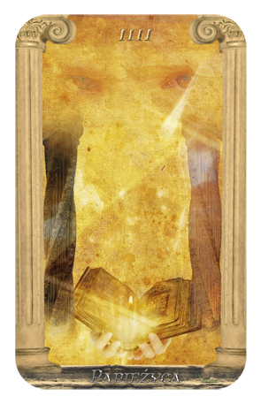 As Buław As Kielichów As Mieczy As Pentakli Czwórka Buław Dziesiiątka Pentakli Gwiazda Świat Wędrowiec Rycerz Mieczy Trójka Kielichów Wisielec As Kielichów Czwórka Buław Eremita Papieżyca Rydwan Wieża Giermek Mieczy Królowa Kielichów Ósemka Buław Rycerz Mieczy Rycerz Pentakli Trójka Pentakli
